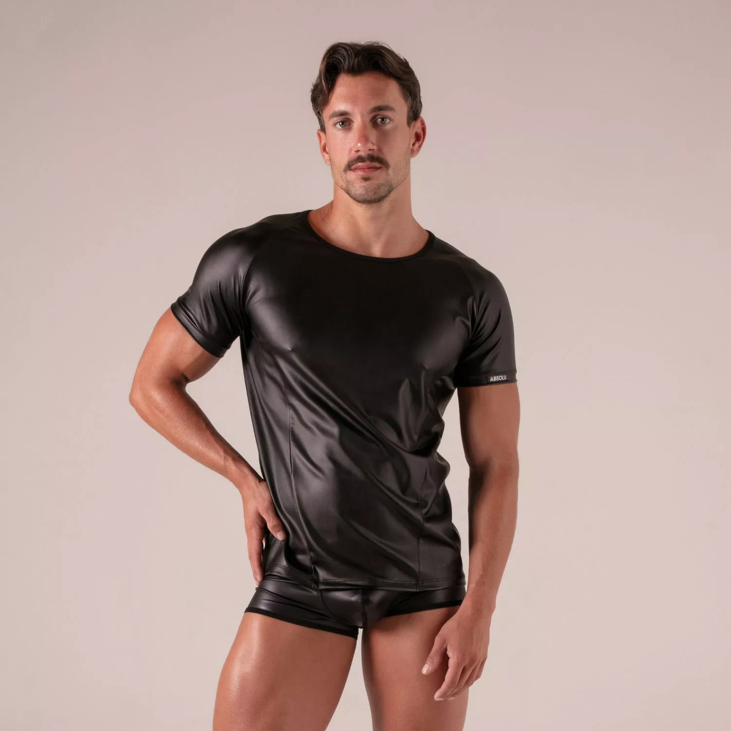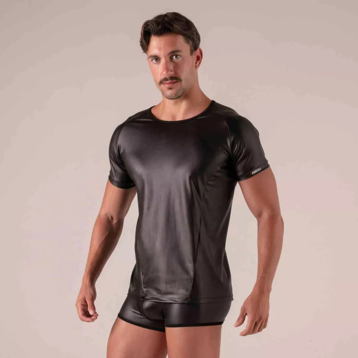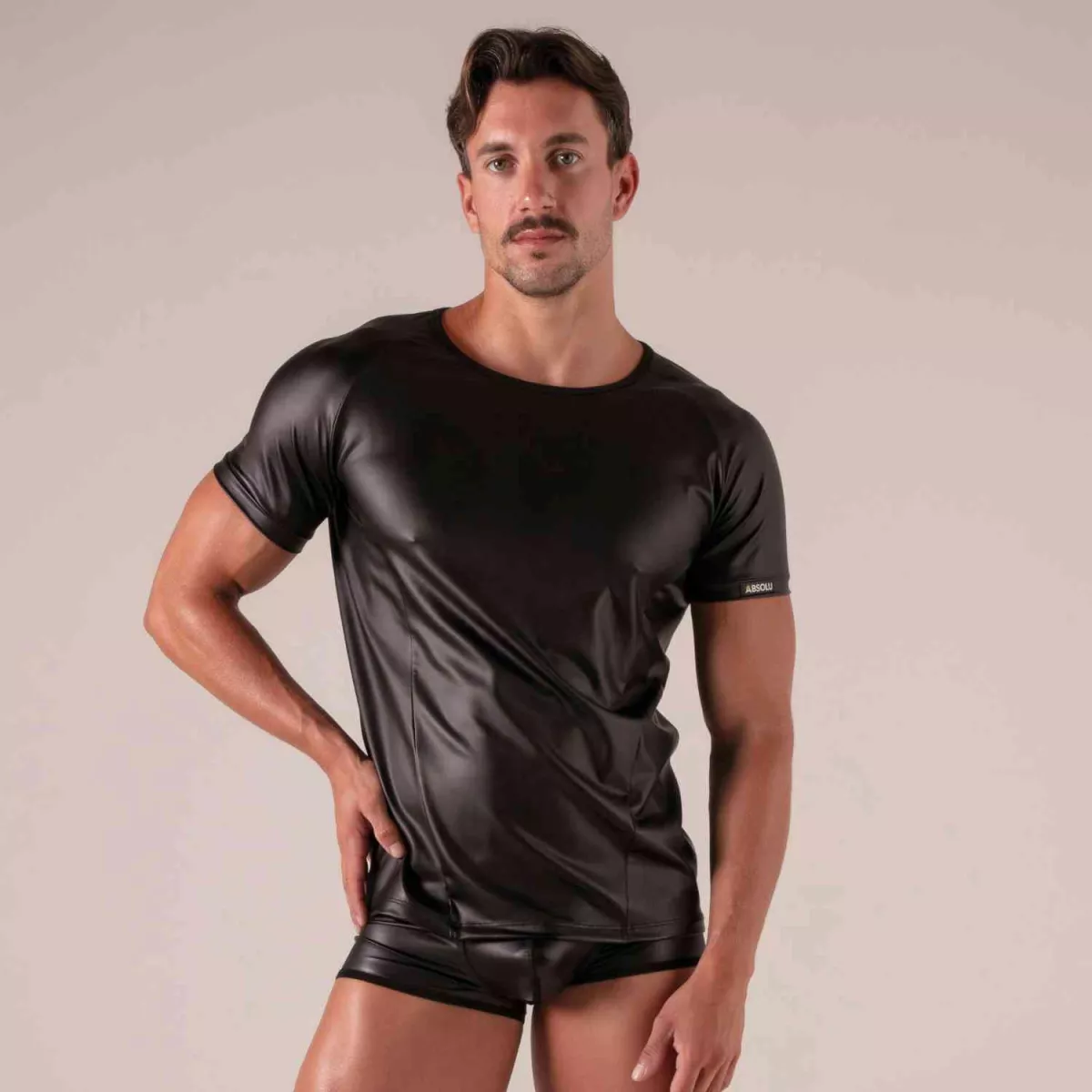Discover the master t-shirt, a blend of masculinity, design and comfort. made from breathable leather-look fabric, this crew neck t-shirt with raglan sleeves shapes the silhouette with strength. its fitted cut highlights the body while ensuring perfect ease. signature detail: the absolu silicone logo on the sleeve, a symbol of modern fetish elegance. A secret pocket is integrated.