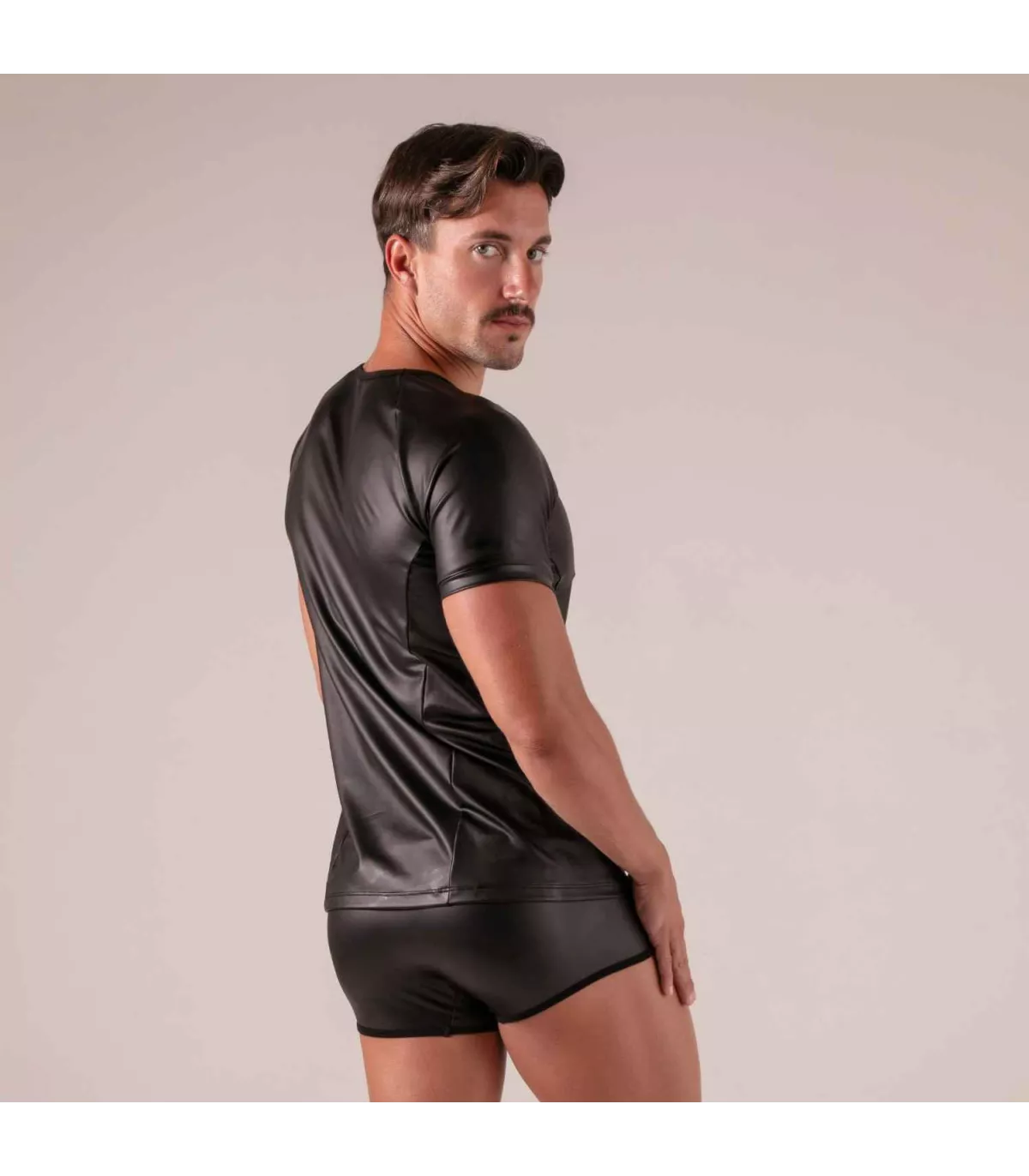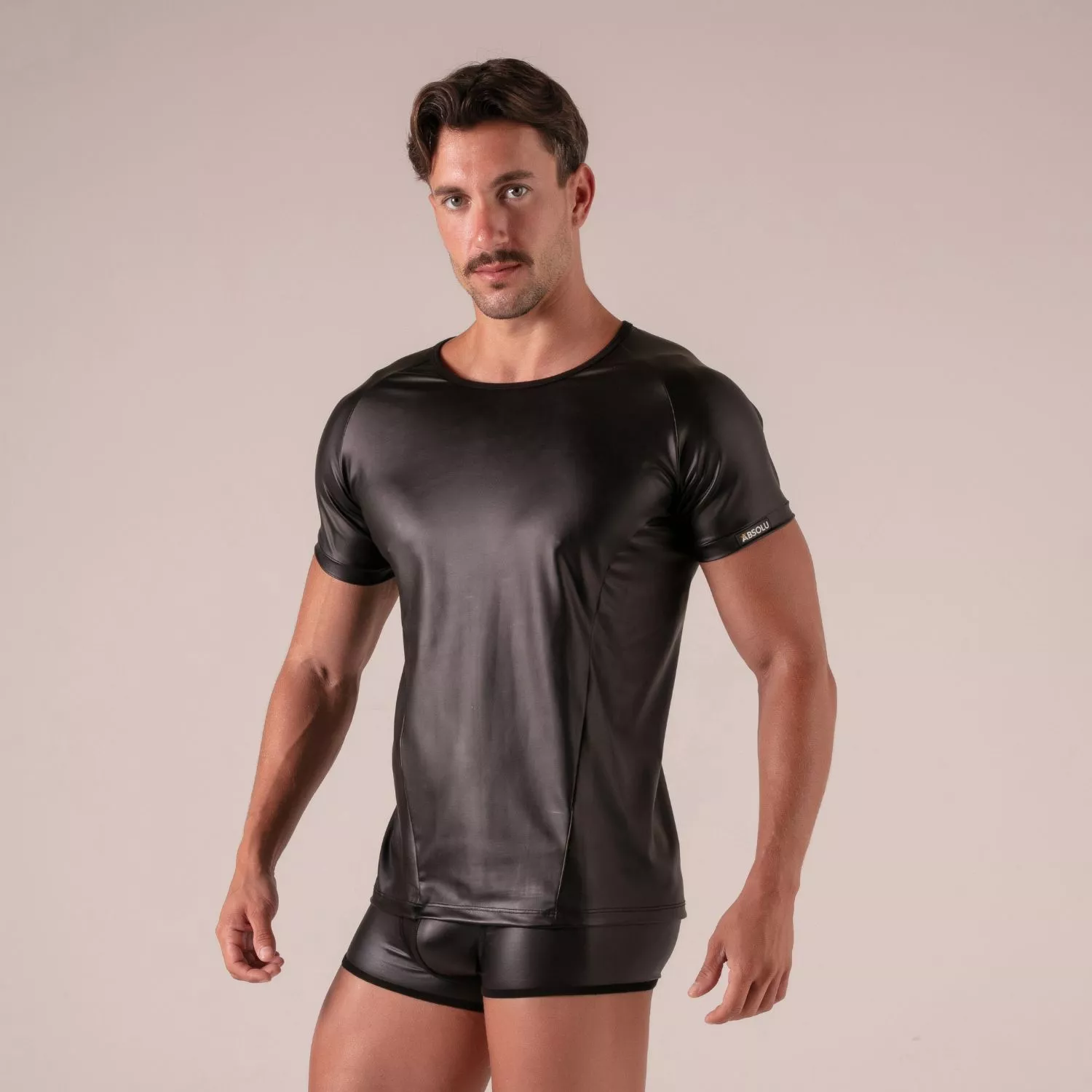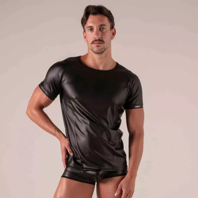 Discover the master t-shirt, a blend of masculinity, design and comfort. made from breathable leather-look fabric, this crew neck t-shirt with raglan sleeves shapes the silhouette with strength. its fitted cut highlights the body while ensuring perfect ease. signature detail: the absolu silicone logo on the sleeve, a symbol of modern fetish elegance. A secret pocket is integrated.