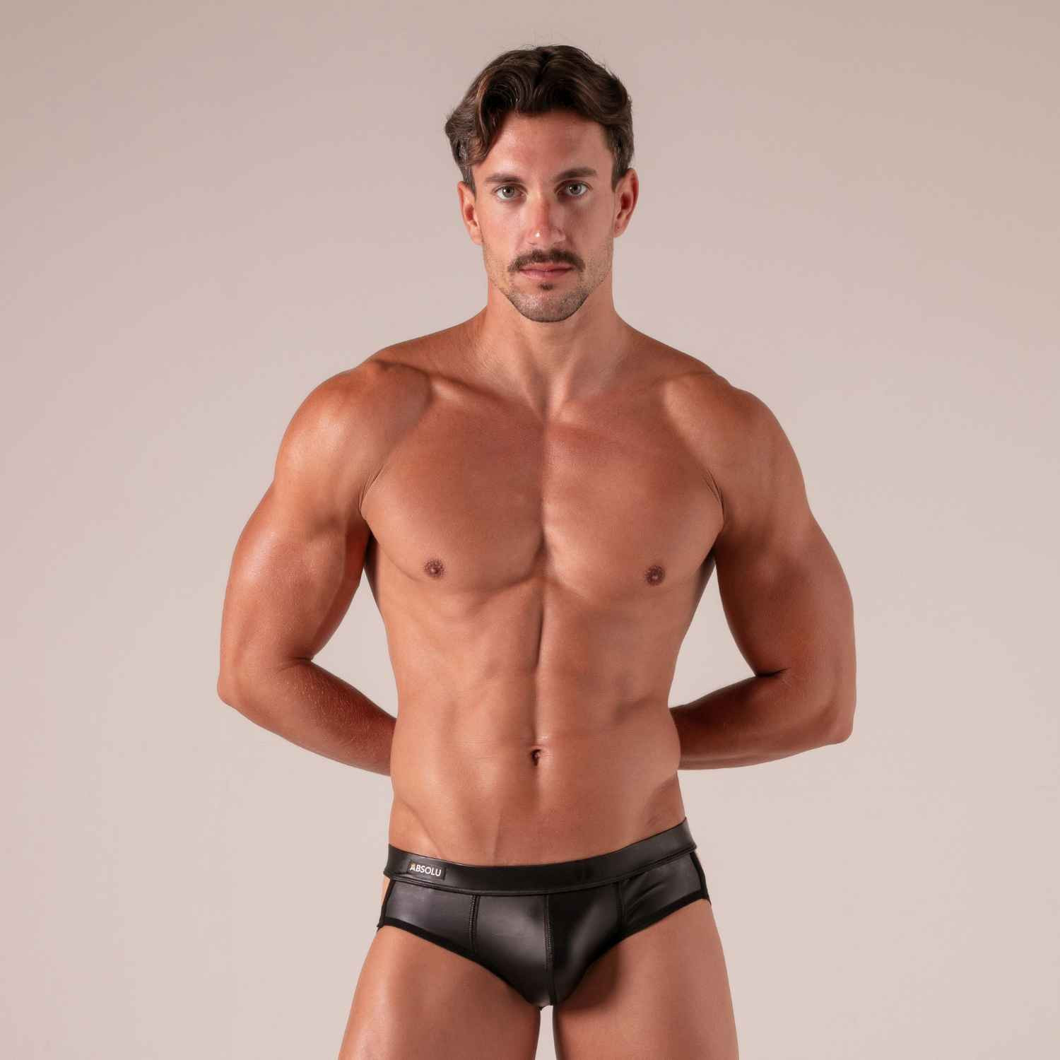 Combine the erotic appeal of a jockstrap with the elegance of a brief thanks to Absolu Male’s strap jockstbrief strap. This innovative faux leather underwear blends the support of a brief with the daring design of a jockstrap, featuring suspender-style straps at the back that leave the buttocks fully exposed. A secret pocket is integrated.