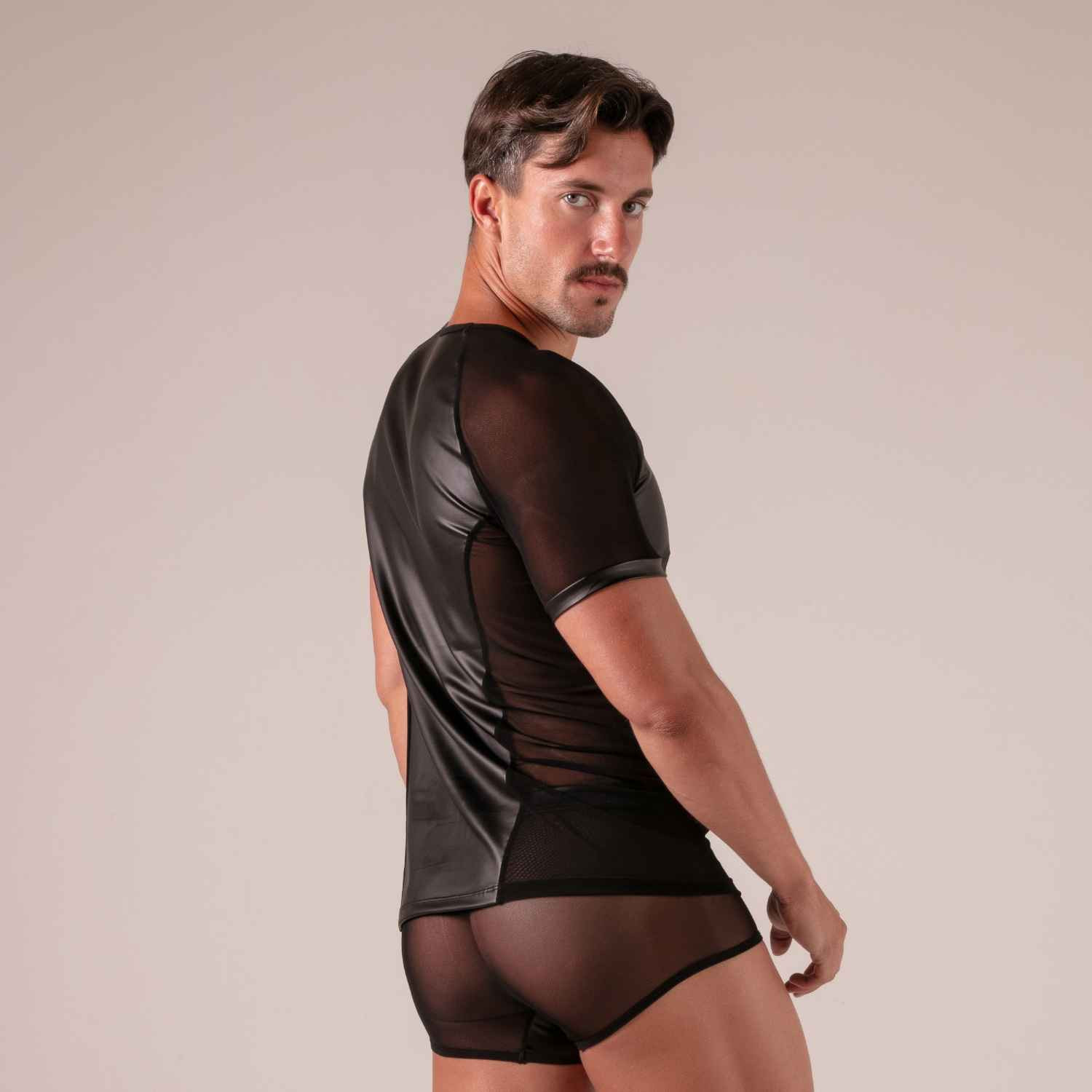 this fitted faux leather t-shirt features a smooth, glossy vegan leather front panel combined with transparent mesh sides, creating a striking visual contrast. short sleeves in fine mesh subtly reveal the skin, enhancing your masculinity. the fitted men’s cut hugs the torso without constriction, flattering the physique.