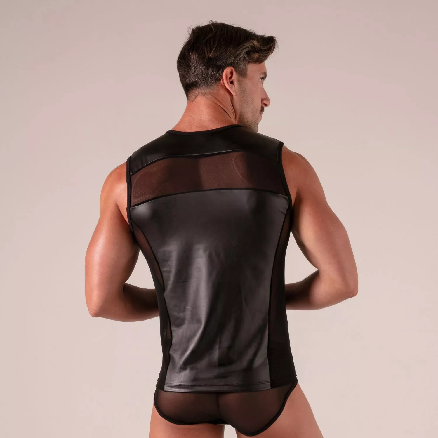 this form-fitting men’s top is designed to contour the upper body. the central faux leather panel emphasizes vertical lines and elongates the figure, while mesh strips on the shoulders and sides create a sensual play of transparency. the round neckline and sleeveless cut accentuate the frame, offering a powerful visual impact.