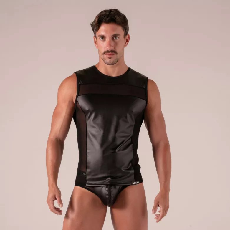 Rebel tank top – faux leather & mesh: masculine power and seduction