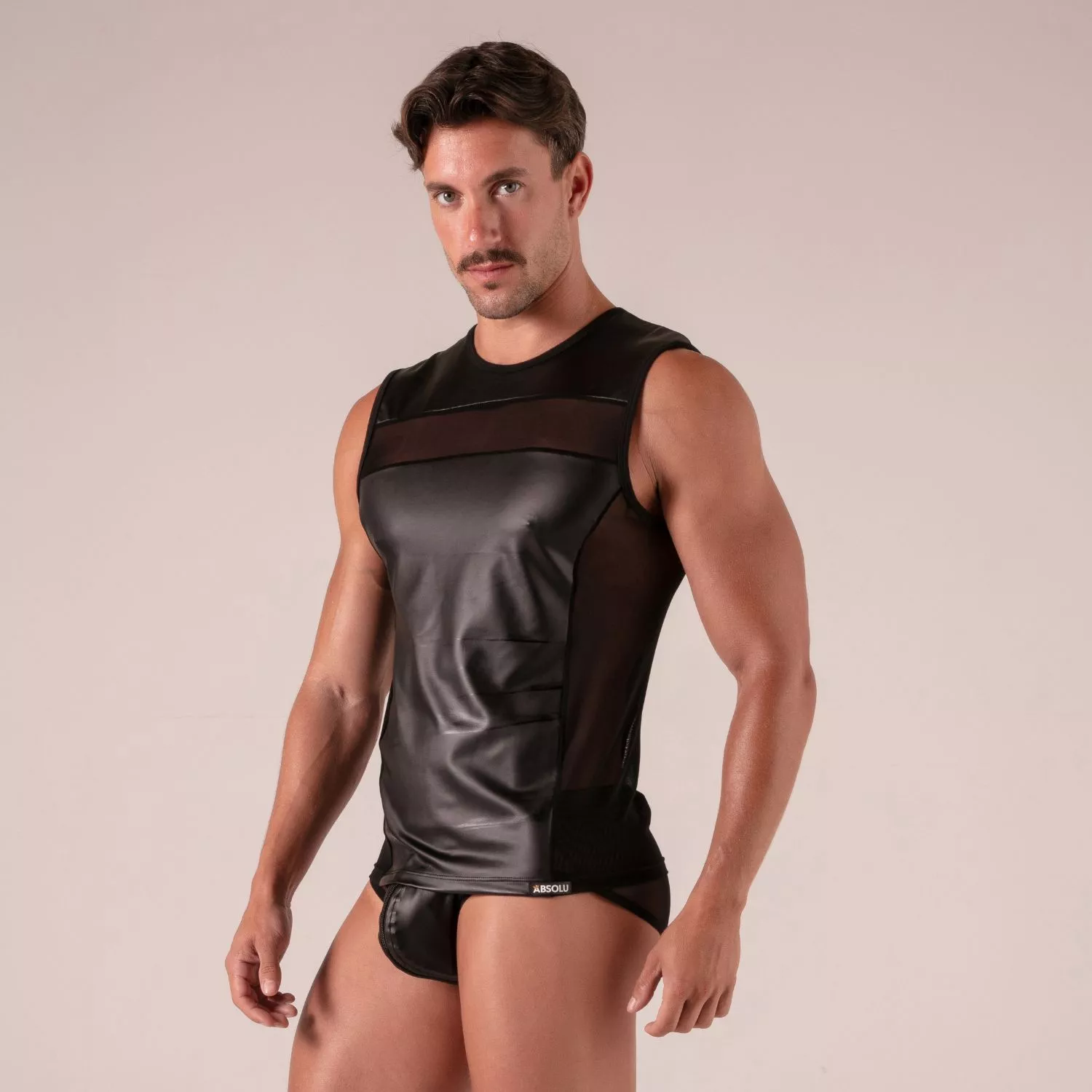 With the men’s faux leather tank top "rebel", absolu male delivers an exceptional piece for lovers of bold style and discreet sensuality. this leather-look tank top invites you to reveal your personality with confidence and elegance. lightweight, form-fitting, and visually striking, it blends matte black faux leather with transparent mesh inserts for a look that’s both masculine and refined.