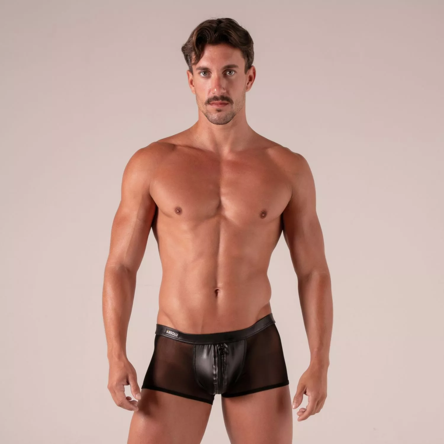 Let your desires speak with the men’s mesh trunks "rebel", an ultra-sexy creation by absolu male. these mesh and faux leather trunks blend suggestive transparency with glossy vegan leather for a look that doesn’t go unnoticed. the front zip adds both erotic flair and practical appeal, enhancing the contrast and the allure.