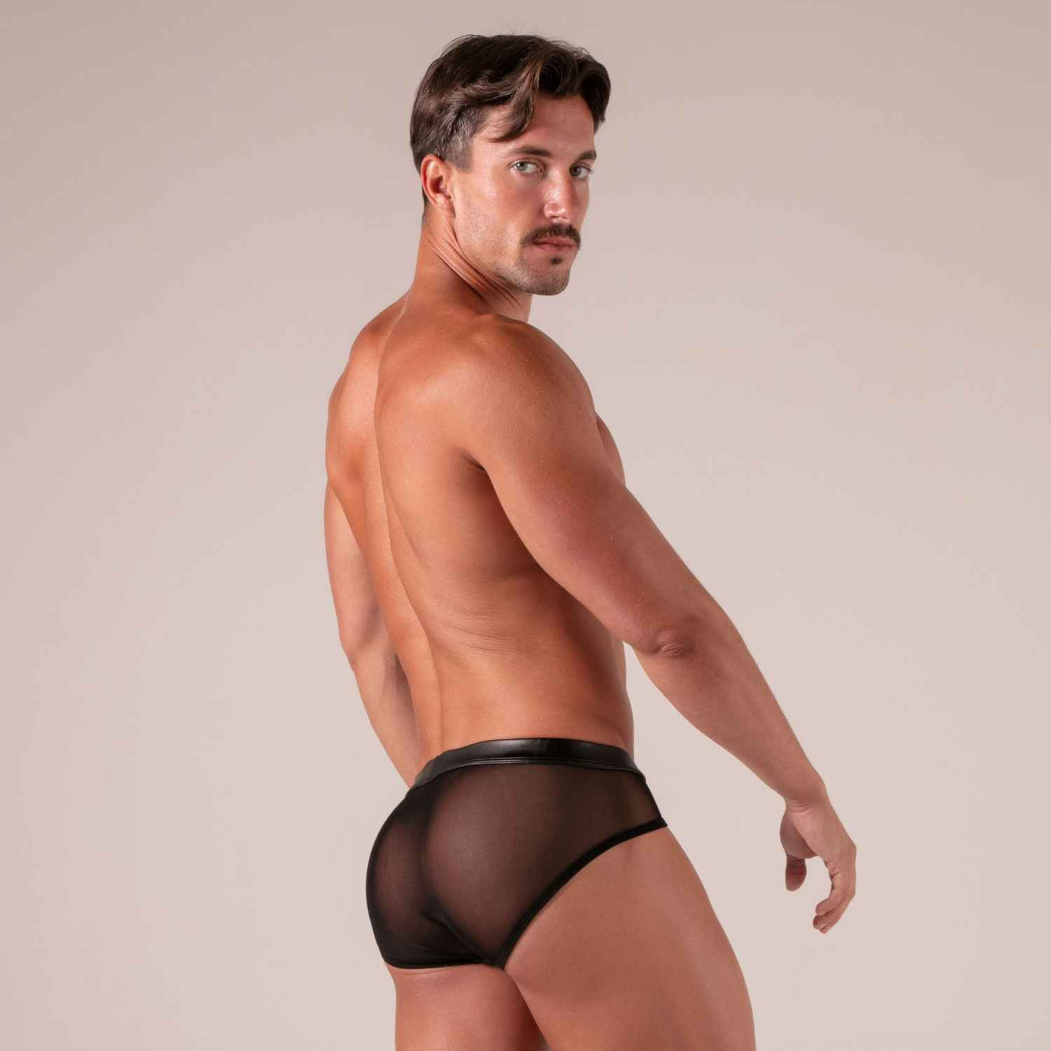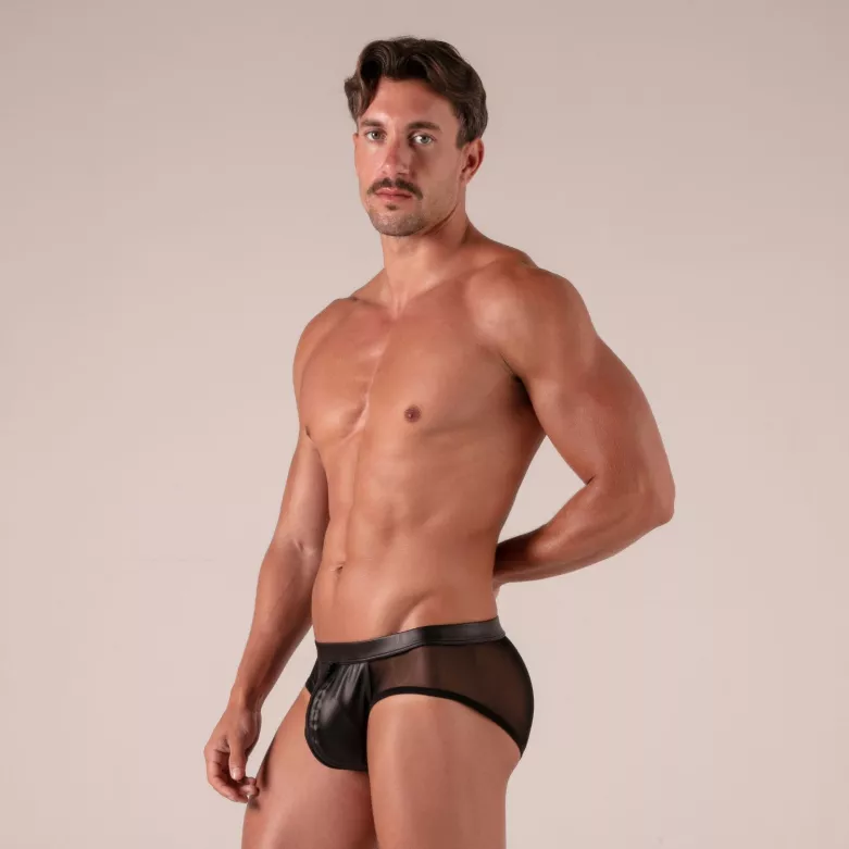 The men’s mesh briefs rebel by absolu male embody the perfect balance of sensuality, elegance, and bold design. these faux leather and mesh briefs draw every eye with their contrasting materials – glossy vegan leather at the front and transparent mesh on the sides – plus a front zip that’s both provocative and refined.