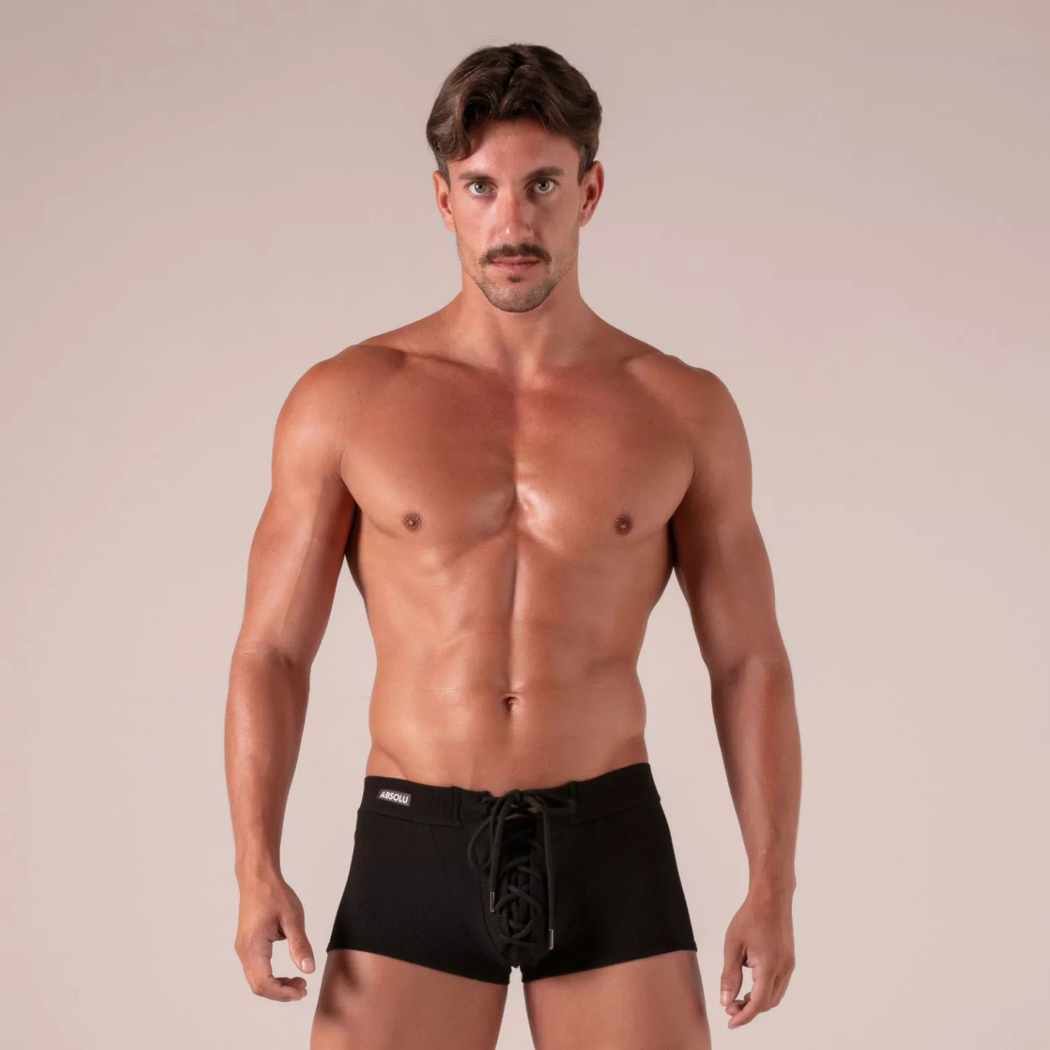 The laced men's boxer by absolu male blends sexy men's lingerie with everyday comfort. crafted from soft ribbed cotton, this fitted short boxer hugs every curve of the body with elegance. its lace-up front pouch, inspired by bondage aesthetics, adds a provocative touch—perfect for those who enjoy seducing without overdoing it.