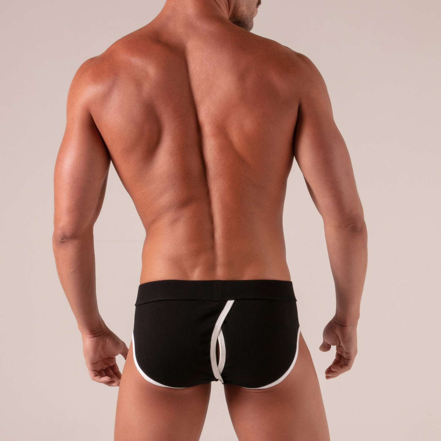 This front and back slit brief combines comfort and function. its ribbed knit material molds to the body's lines while offering a soft touch. the discreet openings invite spontaneous play, making this open men's underwear both stylish and functional.